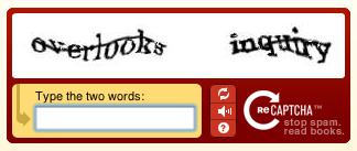 1. Wort Captcha. Hier muss man meist zwei worte eingeben, die relativ schwer lesbar sind.