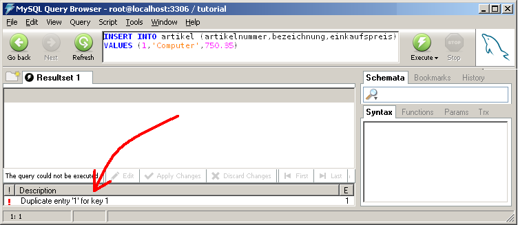 Nach dem Login erstellt der Query Browser eine Database, hier Schema genannt.
