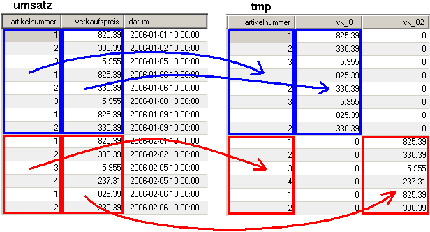 für 4 Zeilen und 2 Spalten 8 Abfragen ausgeführt. Eine Umsatztabelle kann in der