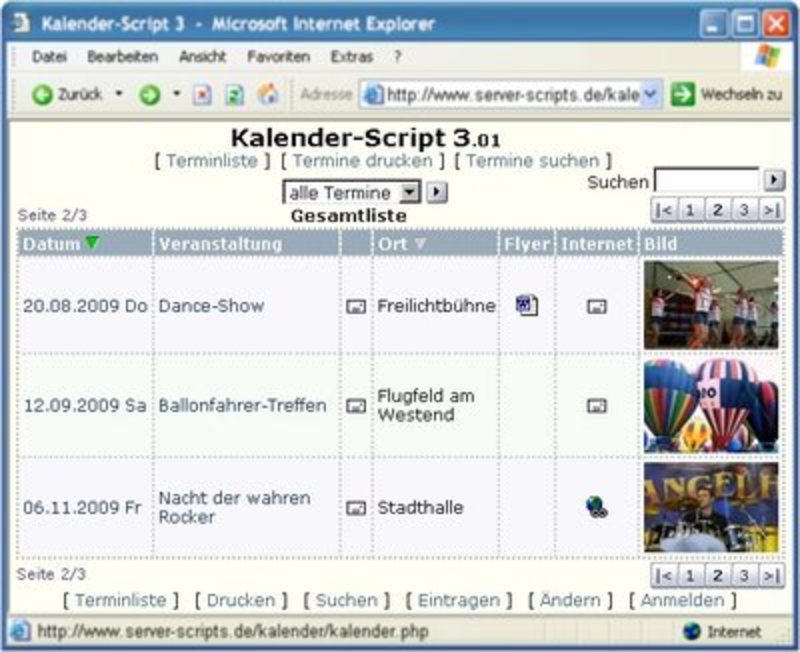 Das Kalender-Script ist ein PHP-Programm zum Führen eines online-Veranstaltungskalender auf Ihrer Webseite. Das Programm listet Ihre Veranstaltungen, Ereignisse, Events oder Termine chronologisch oder nach Veranstaltung und Ort sortiert auf und bietet die Möglichkeit, Details zu interessierenden Terminen aus der Veranstaltungsdatenbank abzurufen. Die Terminstruktur ist dabei individuell einrichtbar.