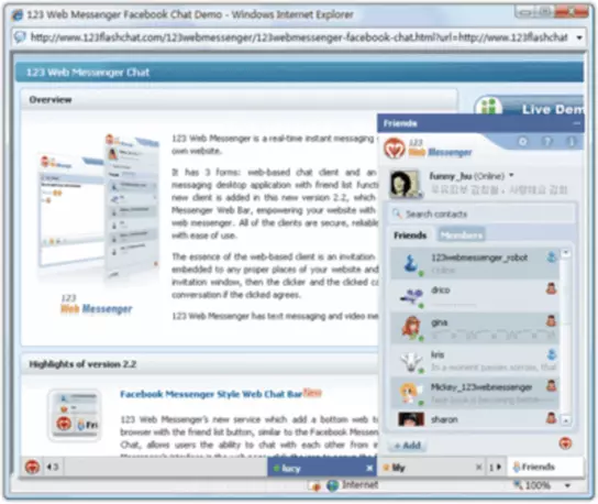 Facebook like instant Messaging is a form of 123 Web Messenger, which allows users the ability to chat with each other or leave offline messages in the Friend List: click the “Friends” icon on bar to popup the Friend List.
