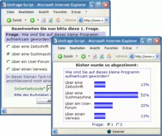Das Umfrage-Script 3.3 ist ein PHP-Programm zur online-Befragung oder online-Abstimmung. Es können eine oder mehrere Fragen mit den entsprechenden Auswahlantworten gestellt werden. Die Ergebnisse des Voting werden summiert und können als Balkendiagramm oder Säulendiagramm grafisch dargestellt werden. Die Umfrage läuft normalerweise anonym, es ist aber auch eine Teilnehmerregistrierung oder ein Benutzerlogin möglich.