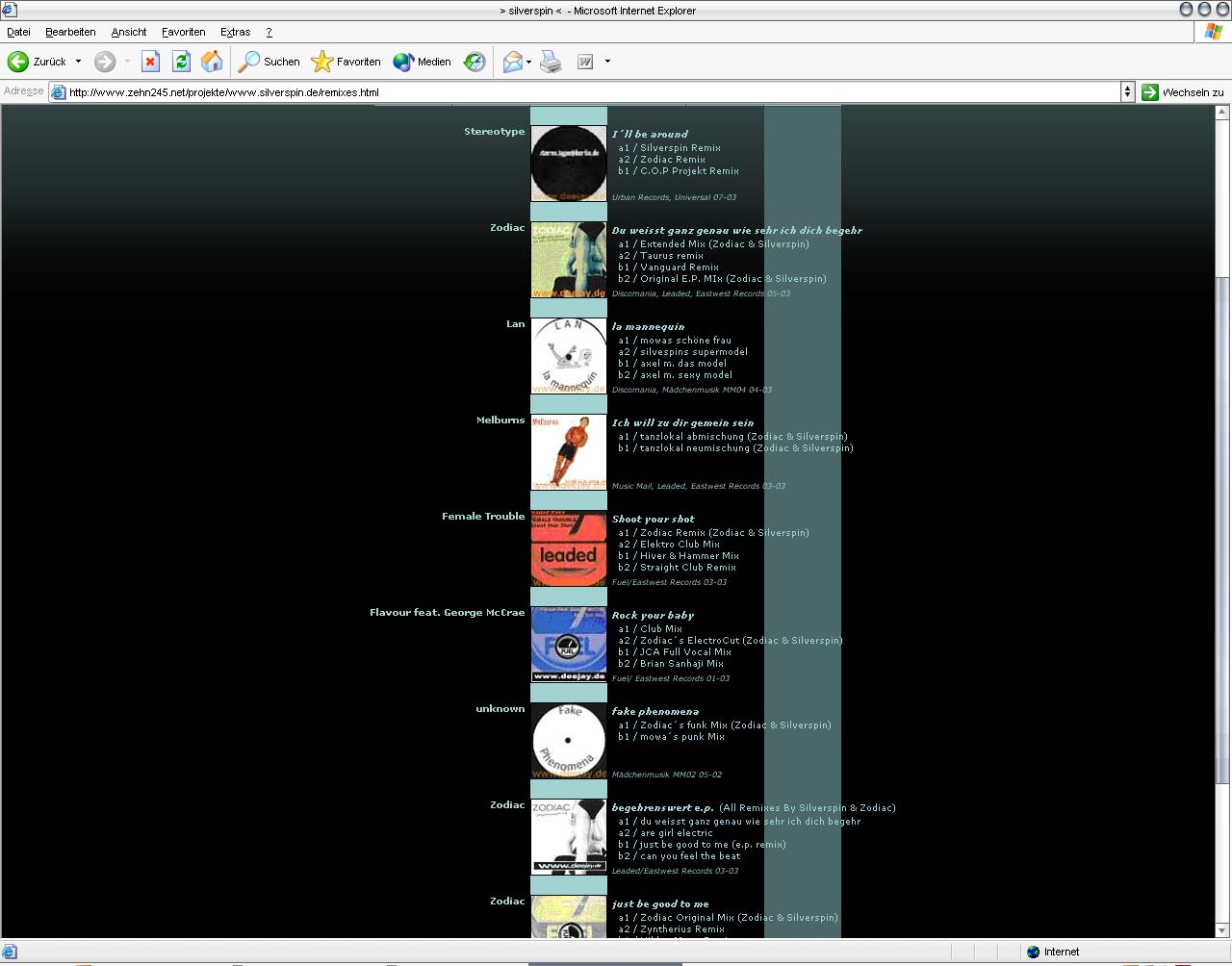 aaaber: auf der seite "remixes" ist ein fehler bzw. fehlverhalten zu sehen. der inhalt dieser seite ist größer als der browser darstellen kann. daher muß gescrollt werden. scrollt man nun nach unten (aber nur soweit, daß das menü noch zu sehen ist), und fährt dann mit der maus über die einzelnen menüpunkte, sieht man diesen fehler. der nach unten gefärbte balken endet mitten in der seite. obwohl ich angegeben habe, daß die höhe 100% sein soll. es sieht so aus, daß 100% hier die höhe des browser-fensters bedeutet und nicht des gesamten inhalts.