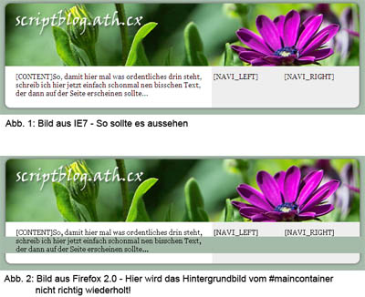 Das erste vom IE7. Der zeigt das so an, wie es sein soll. Das zweite vom Firefox. Der wiederholt das Hintergrundbild leider nicht oft genug!