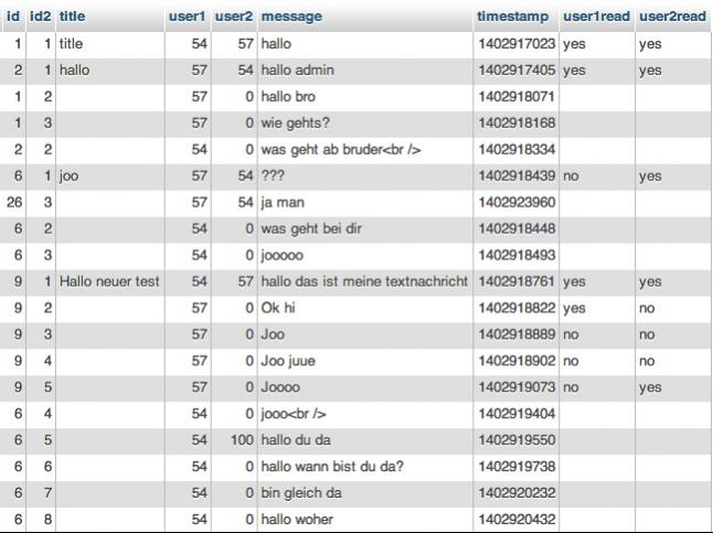 Nun zu meinem Problem, die Nachrichten werden untergeordnet gespeichert, das heißt Nachrichten Verlauf 1 bekommt id 1 zugewiesen, id2 trägt dabei die einzelnen Nachrichten dessen Verlauf.