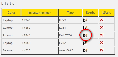 Bild2 erzeugt eine Liste der gespeicherten Geräte. Mit dem klick auf das (mit Kreis gekennzeichent) Bearbeitungs-Symbol werden diese Daten aus der Datenbank gelesen und wieder in die Maske geladen um diese bei Bedarf zu bearbeiten. Nur die Inventarnummer kann nicht mehr verändert werden, dieses Feld ist dann nur readonly.