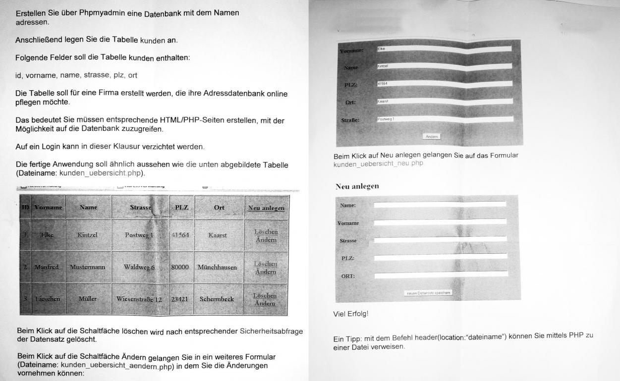 Hallo, ich habe eine sehr knifflige Aufgabe mit Hyperlinks. Für mich auf jeden Fall. In einer Tabelle soll in jeder Spalte per Hyperlink eine Weiterleitung auf die nächste php-Seite erfolgen, wo man die einzelnen Datensatzeinträge bearbeiten kann, oder aber auch löschen mit wiederum einem zweiten hyperlink. Falls sich Einer von Euch damit mal auseinandersetzen will, die genaue Aufgabenstellung habe ich angehängt als jpg. Ich stehe da total auf dem Schlauch. Die Datenbank und die Tabelle habe ich natürlich schon erstellt in HTML. Ich bin blutige Anfängerin und für jeden Tipp von einem Experten dankbar. Es handelt sich um eine Prüfungsarbeit.